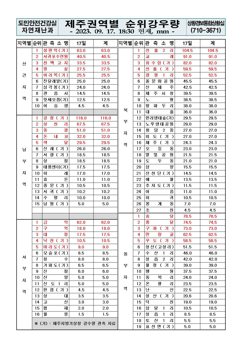 제주지역 누적강우량 2023. 9. 17 (일) 18:30 현재