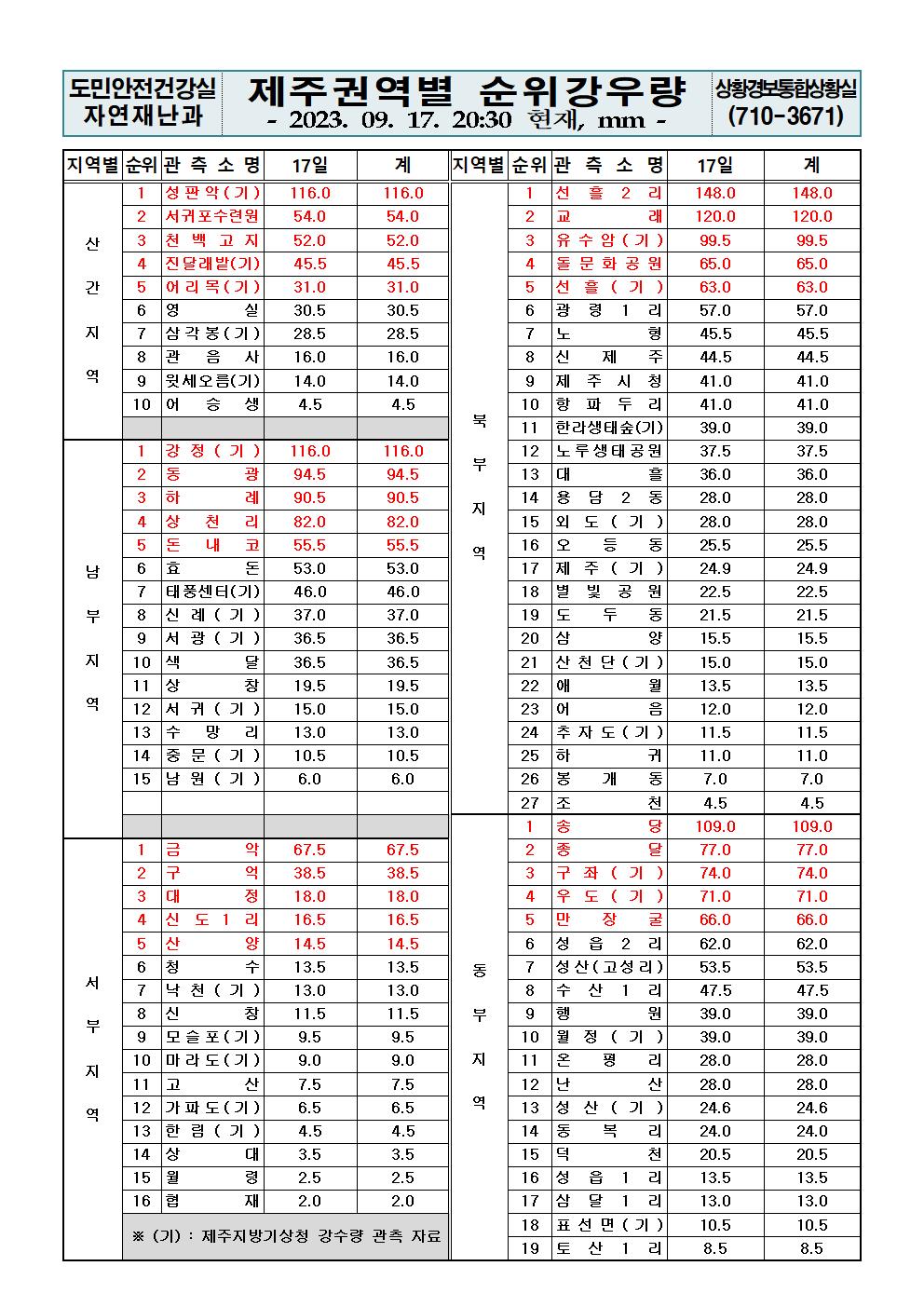 제주지역 누적강우량 2023. 9. 17 (일) 20:30 현재