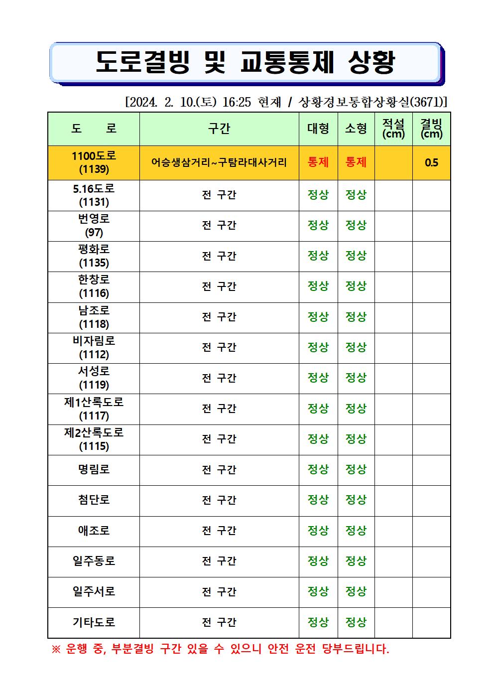 도로결빙 및 통제상황 2024.2.10.(토) 16시25분 현재