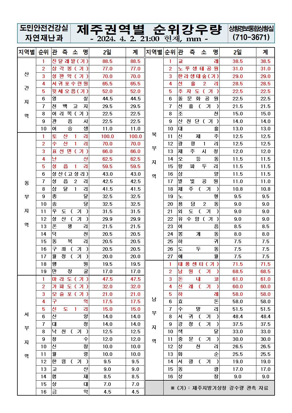 제주지역 누적강우량 2024. 4. 2.(화) 21:00 현재