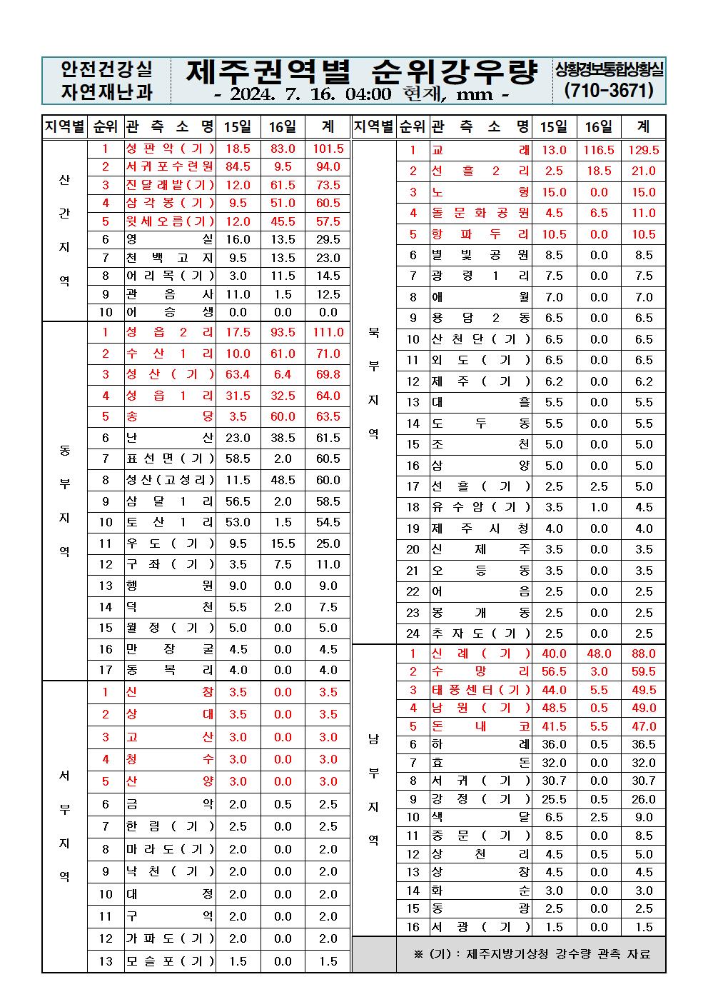 제주지역 누적강우량 2024. 7. 16.(화) 04:00 현재