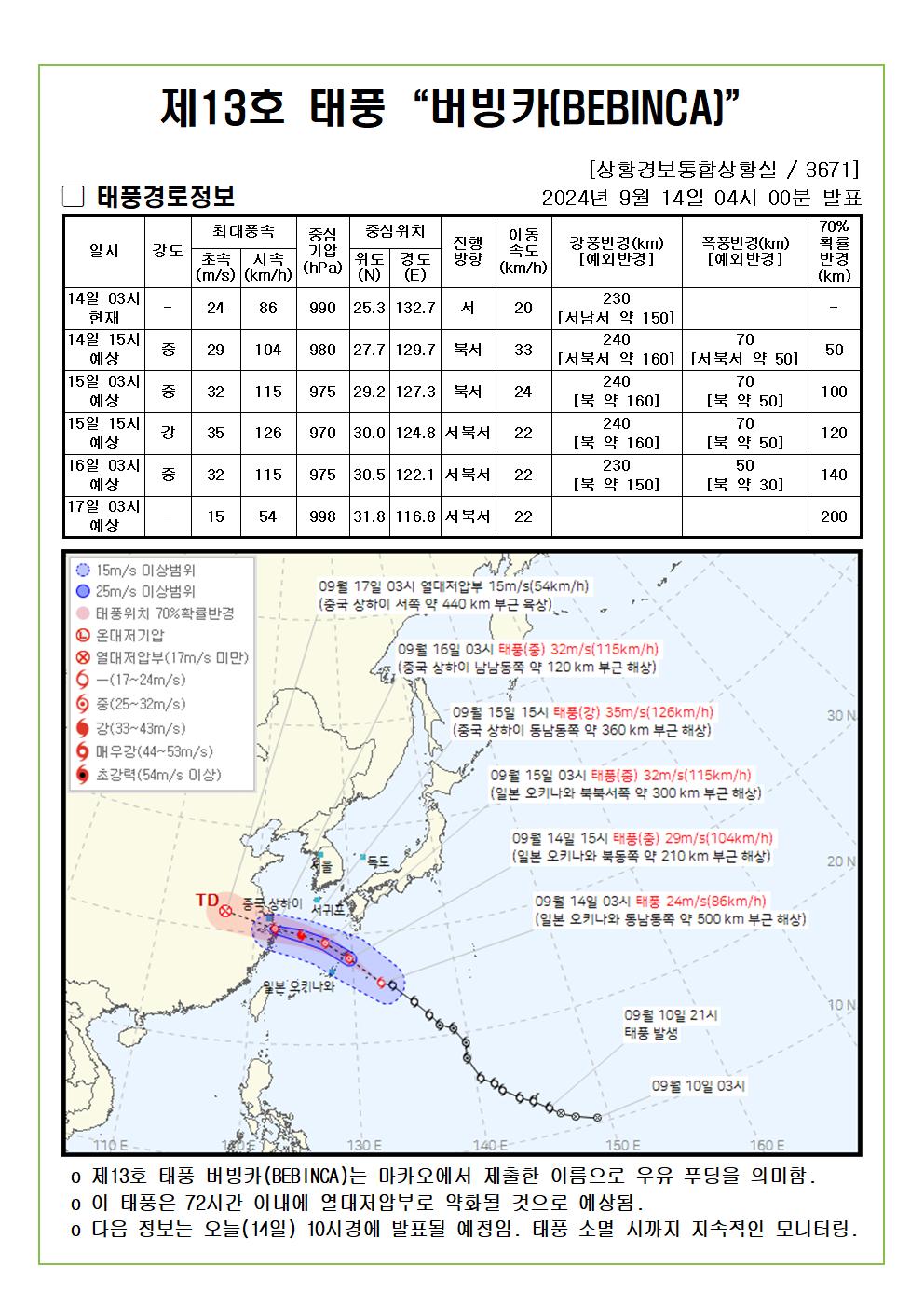 제13호 태풍 버빙카 예상진로도 2024. 09. 14. 04시00분 발표