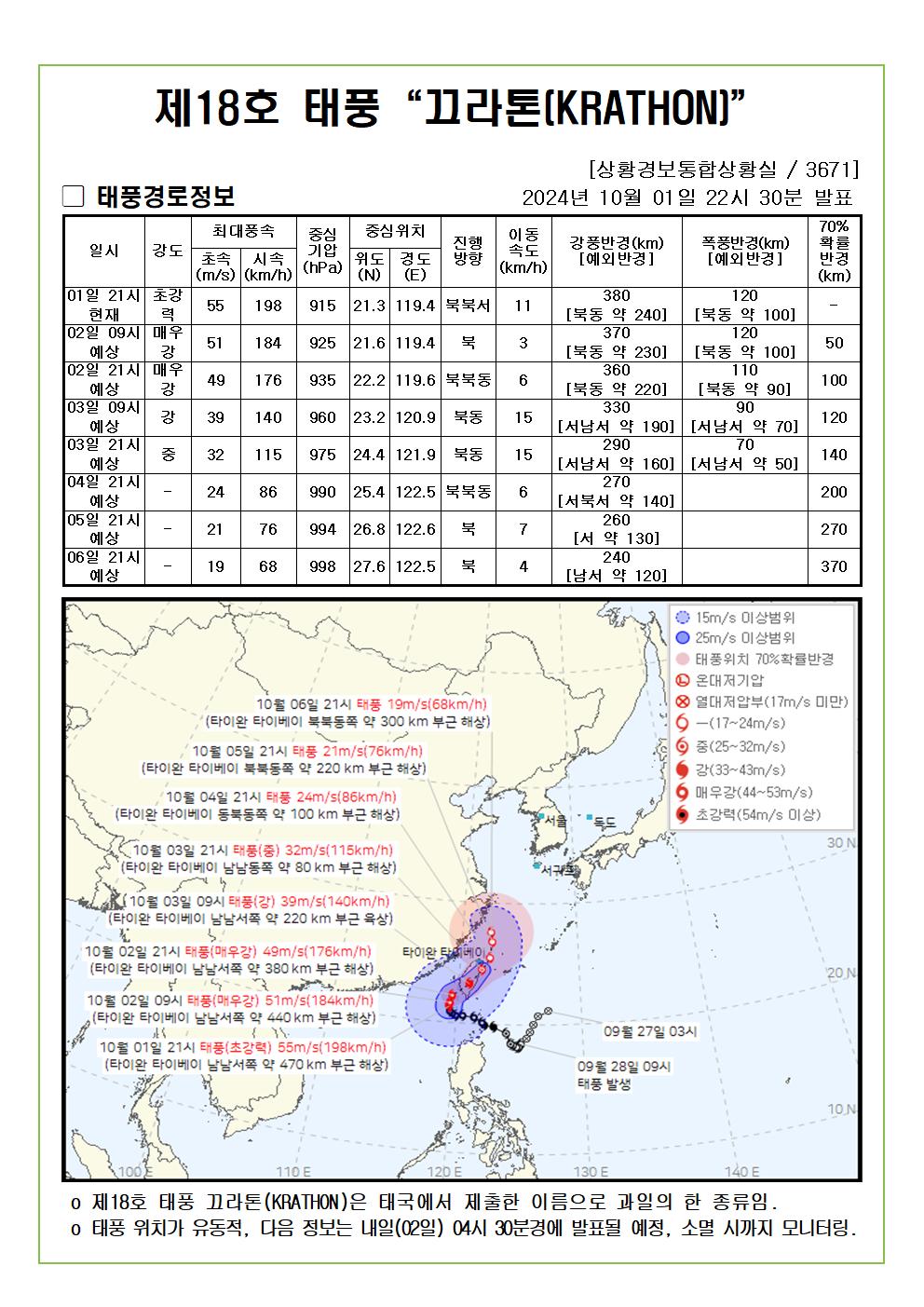 제18호 태풍 끄라톤 예상진로도 2024. 10. 01. 22시30분 발표