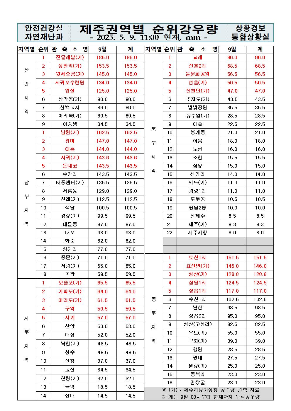 제주지역 누적강우량 2025. 05. 09.(금) 11:00 현재
