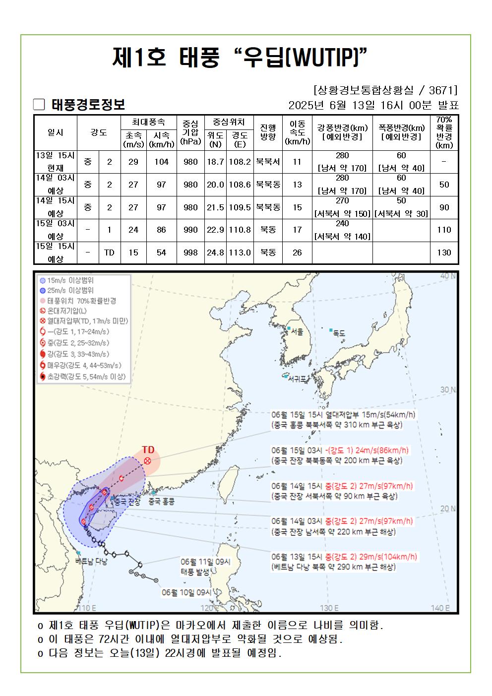 제1호 태풍 우딥 예상진로도 2025. 06. 13. 16시00분 발표