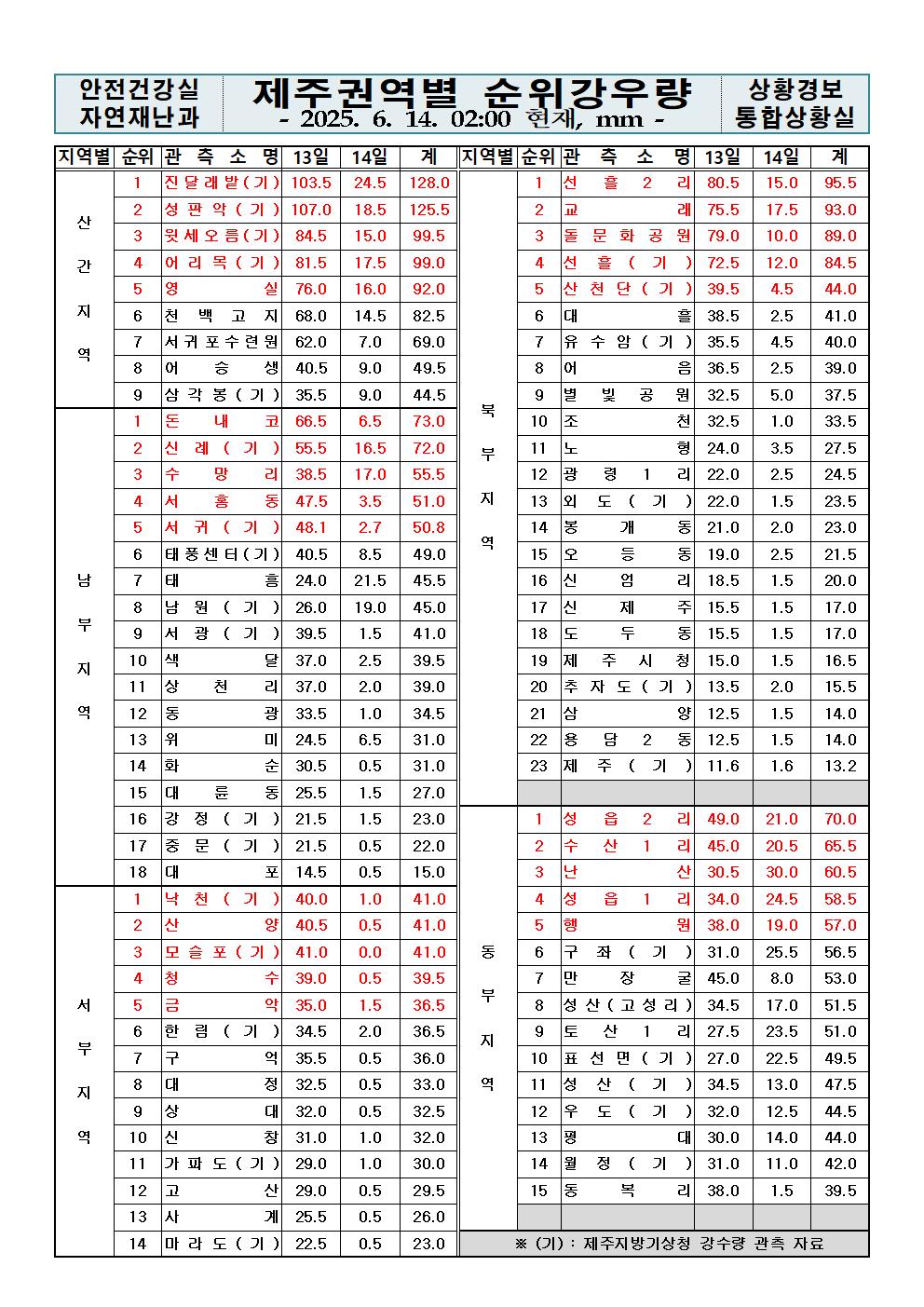 제주지역 누적강우량 2025. 06. 14.(토) 02:00 현재