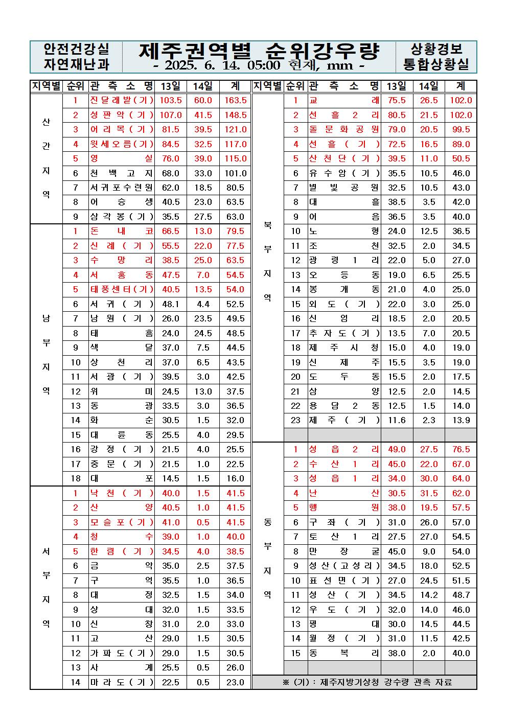 제주지역 누적강우량 2025. 06. 14.(토) 05:00 현재