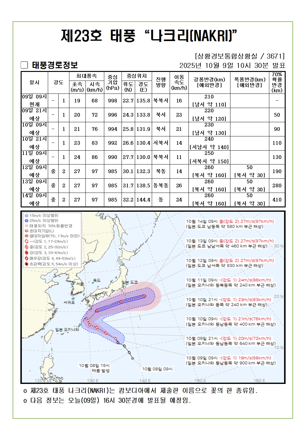 제23호 태풍 나크리 예상진로도 2025. 10. 09. 10시30분 발표