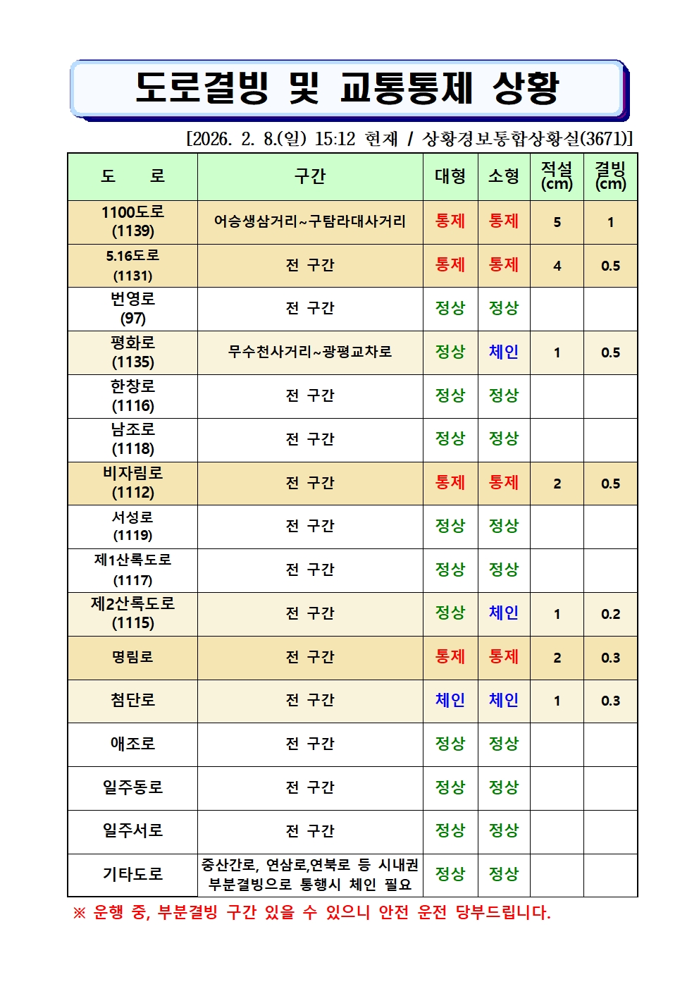 도로결빙 및 통제상황 2026.2.8.(일) 15시 12분 현재