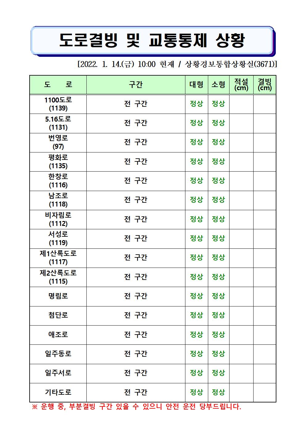 도로결빙 및 통제상황 2022.1.14.(금) 10시 00분 현재