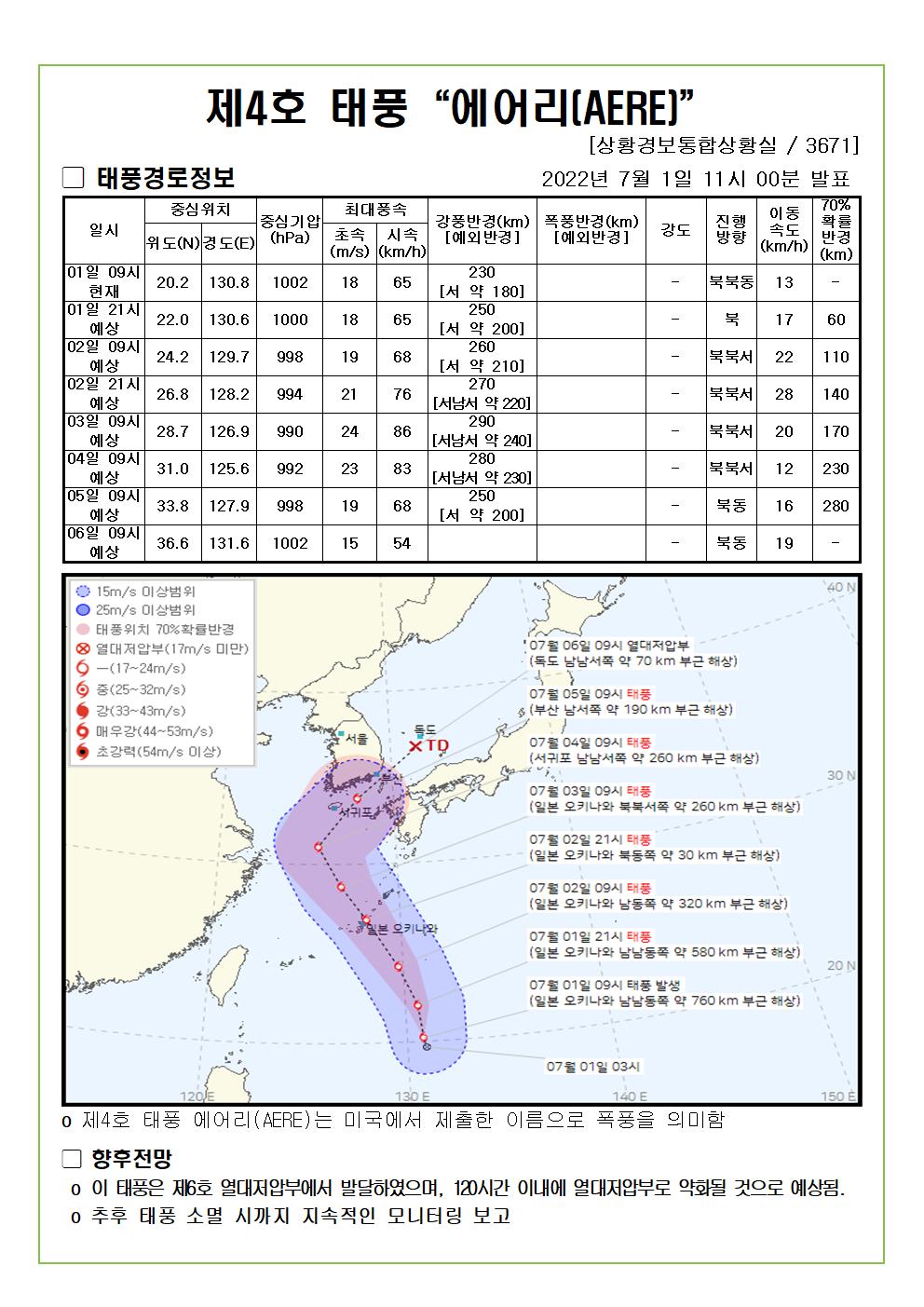 제1호 태풍 말라카스 예상진로도 2022. 7. 01. 11시00분 발표
