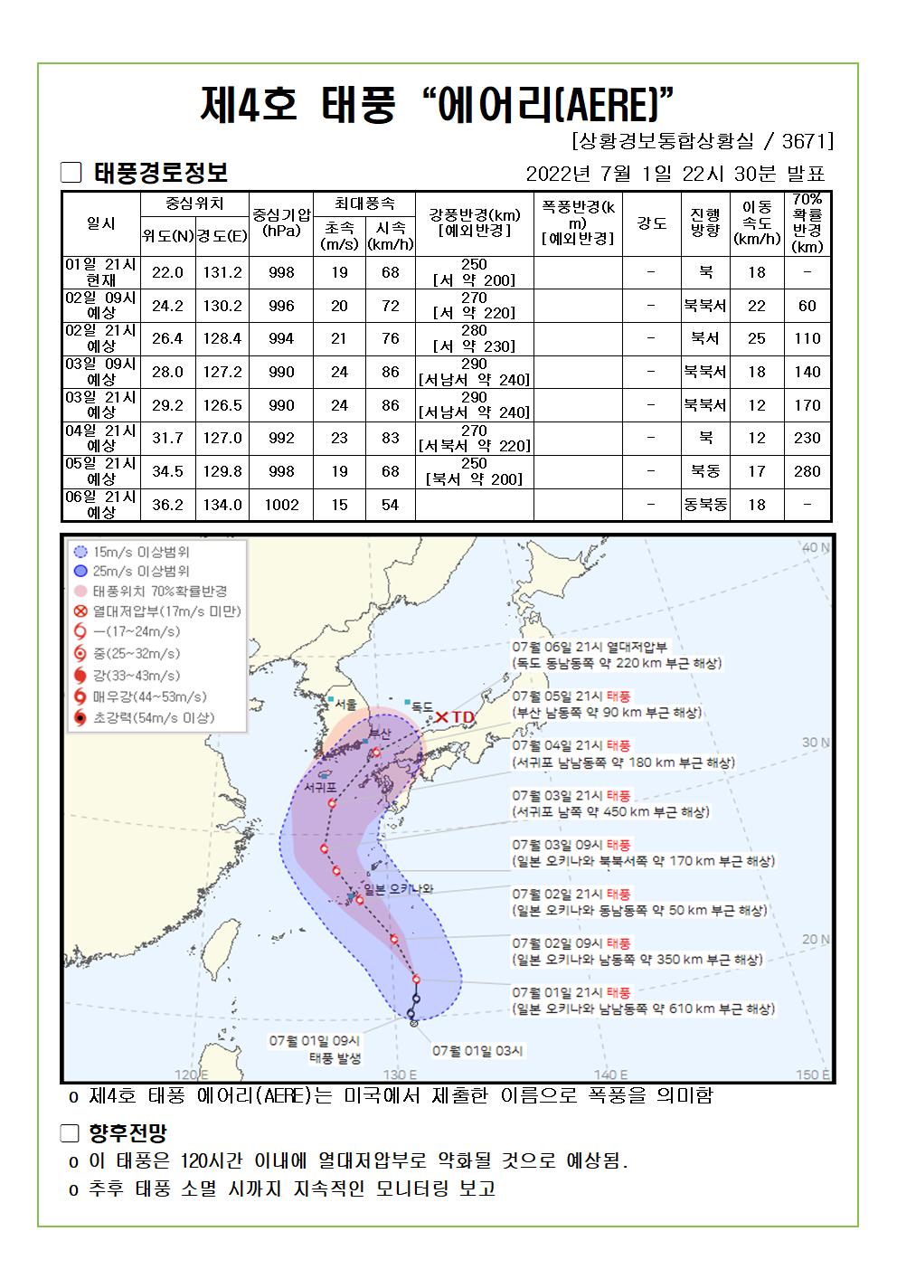 제4호 태풍 에어리 예상진로도 2022. 7. 1. 22시30분 발표