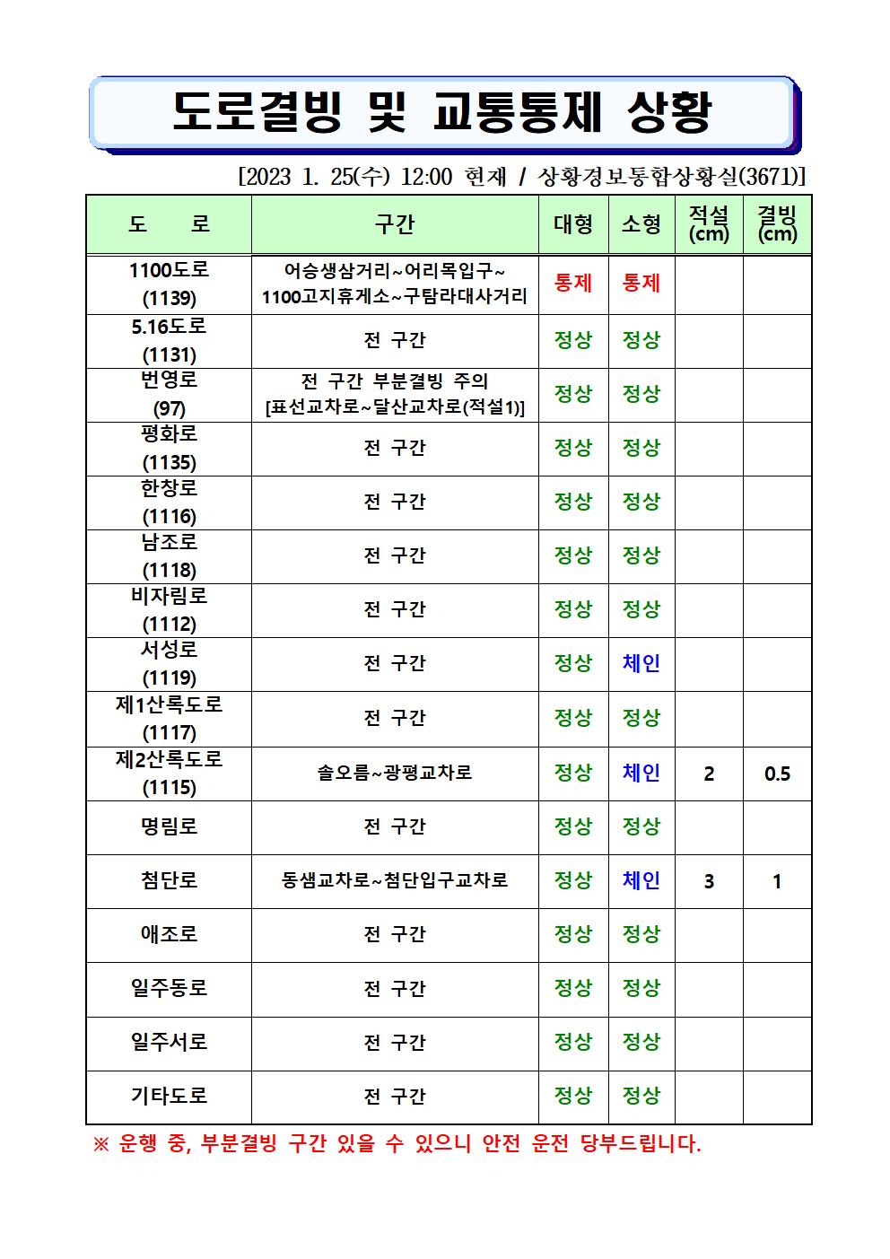 도로결빙 및 통제상황 2023.1.25.(수) 12시00분 현재