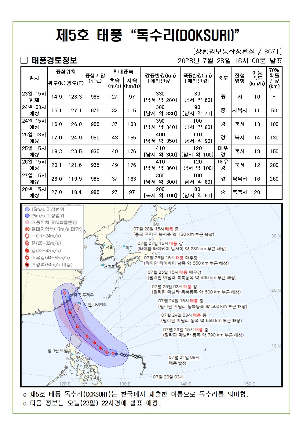 제5호 태풍 "독수리" 예상진로도 2023. 7. 23.(일). 16:00분 발표